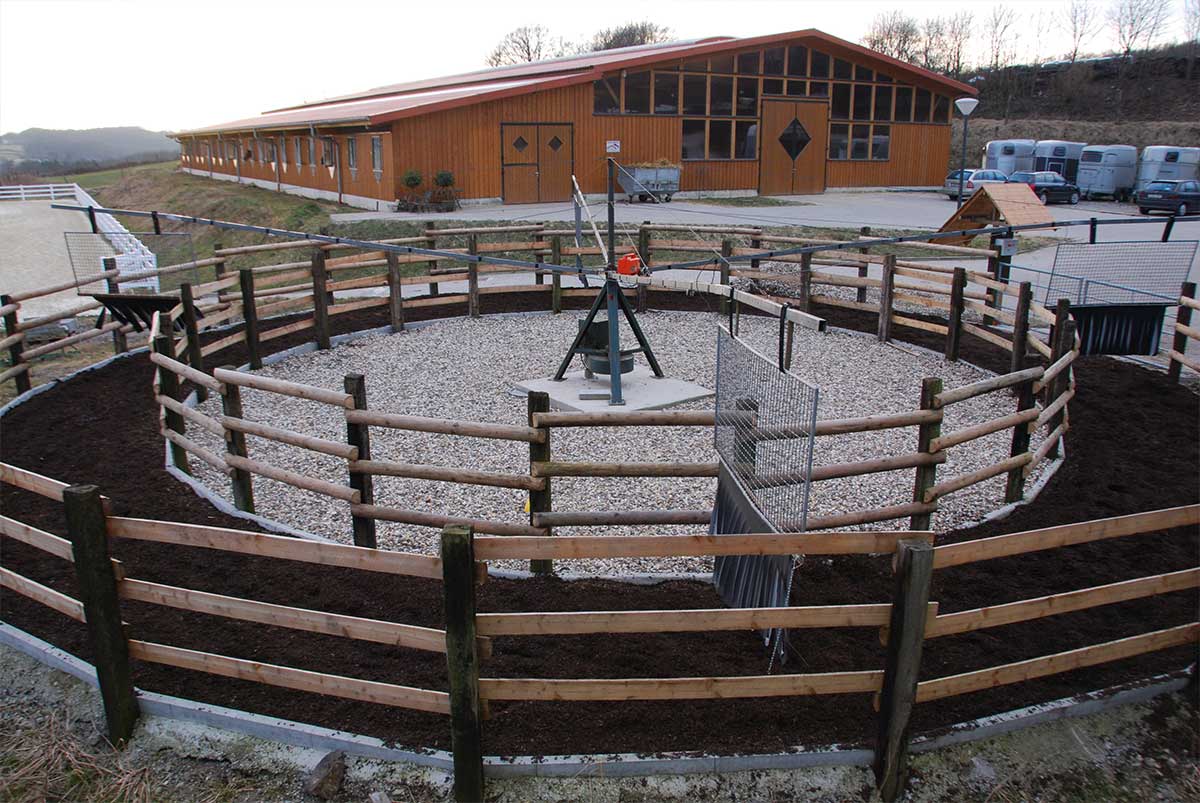 Die Führanlage besitzt 4 Laufsegmente und einen ca. 2m breiten Laufgang. Sie bietet die gute Möglichkeit, auch verletzten oder alten Pferden Bewegung an der frischen Luft zu verschaffen.